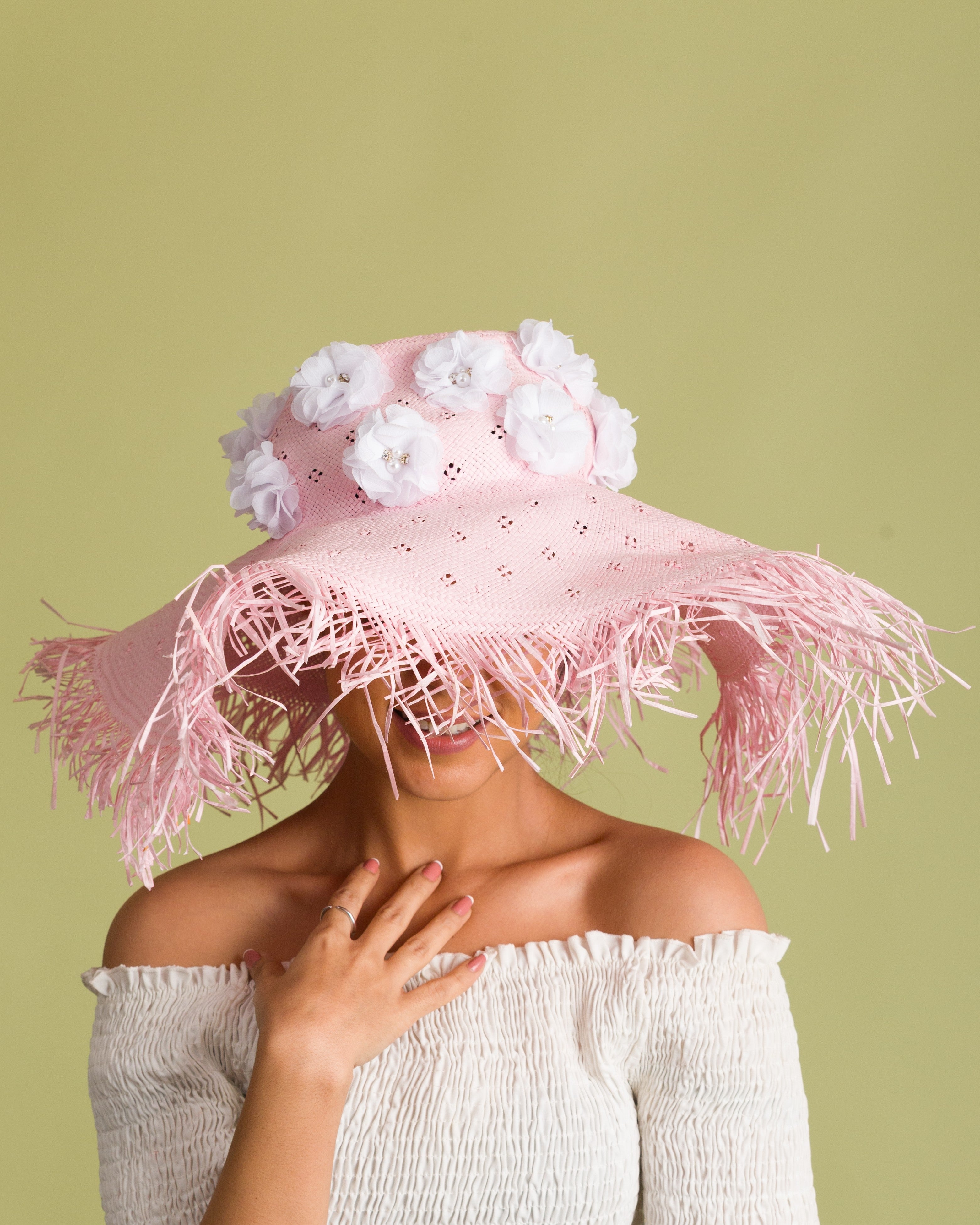 This refined paper woven sun hat showcases a blush pink palette enhanced by graceful fringe detailing that moves fluidly with every step. Adorned with dimensional white organza flowers, it delivers both protective functionality and artistic elegance. The lightweight paper weave construction ensures breathability and comfort in warm climates, while the flowing silhouette creates an effortlessly sophisticated appearance. Ideal for those who appreciate quality millinery that balances sun safety with contemporary style. A versatile accessory for upscale outdoor occasions and everyday summer wear.