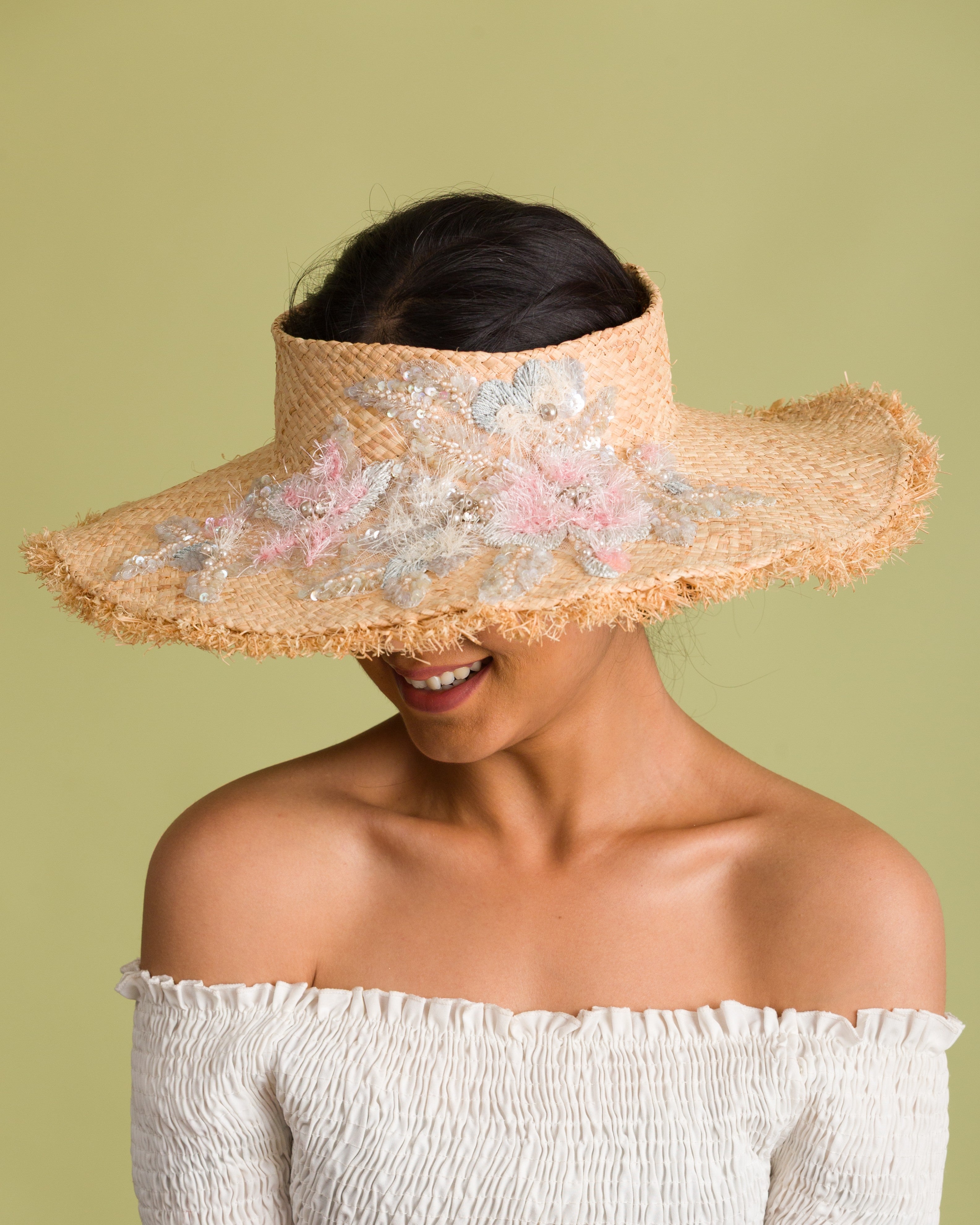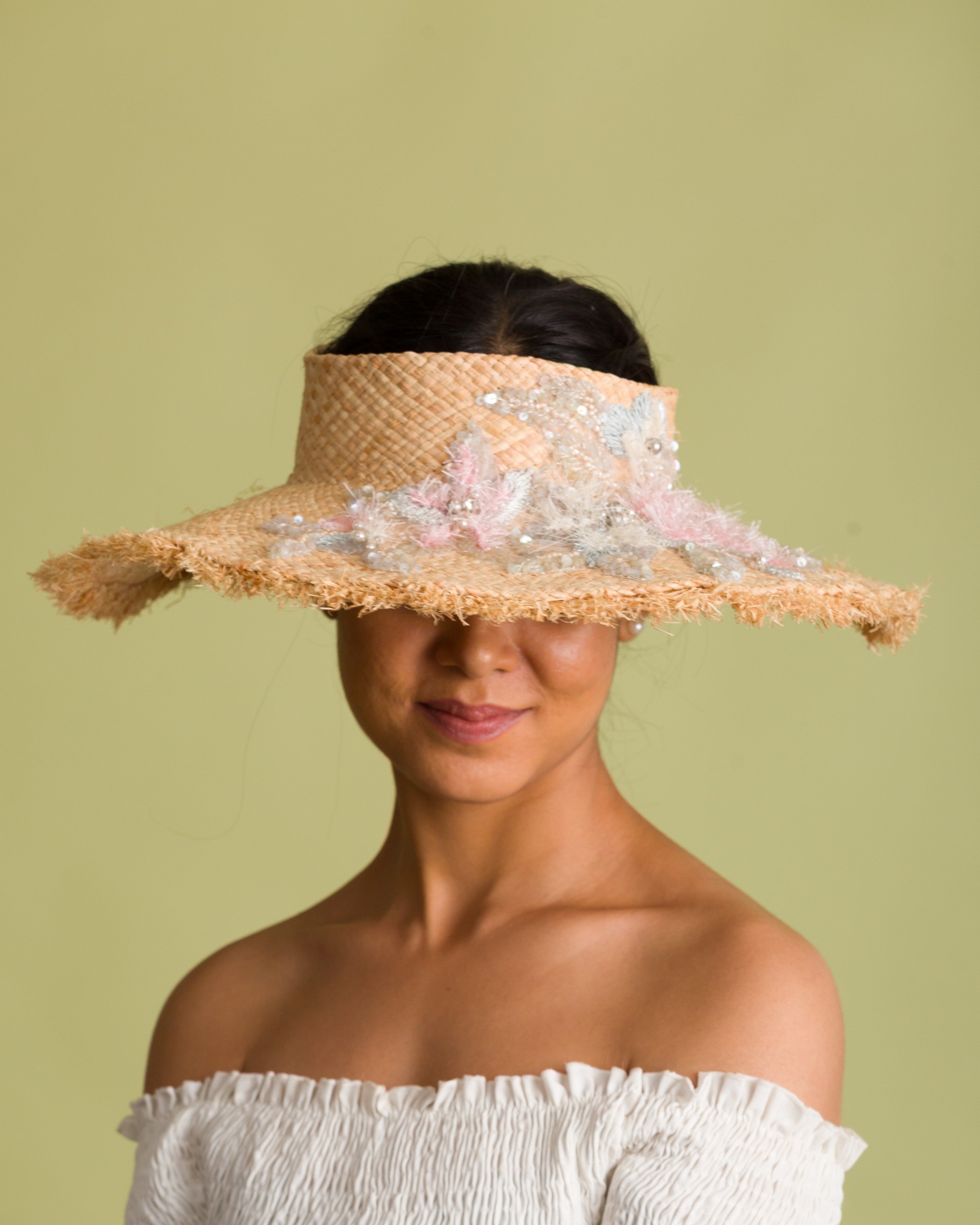 Enhance your ensemble with this one-of-kind versatile rollable visor sun hat. This handmade fashionable and sophisticated headpiece is designed to elevate the overall look styled for various occasions, such as semi formal summer events, beach parties or stylish informal outings.