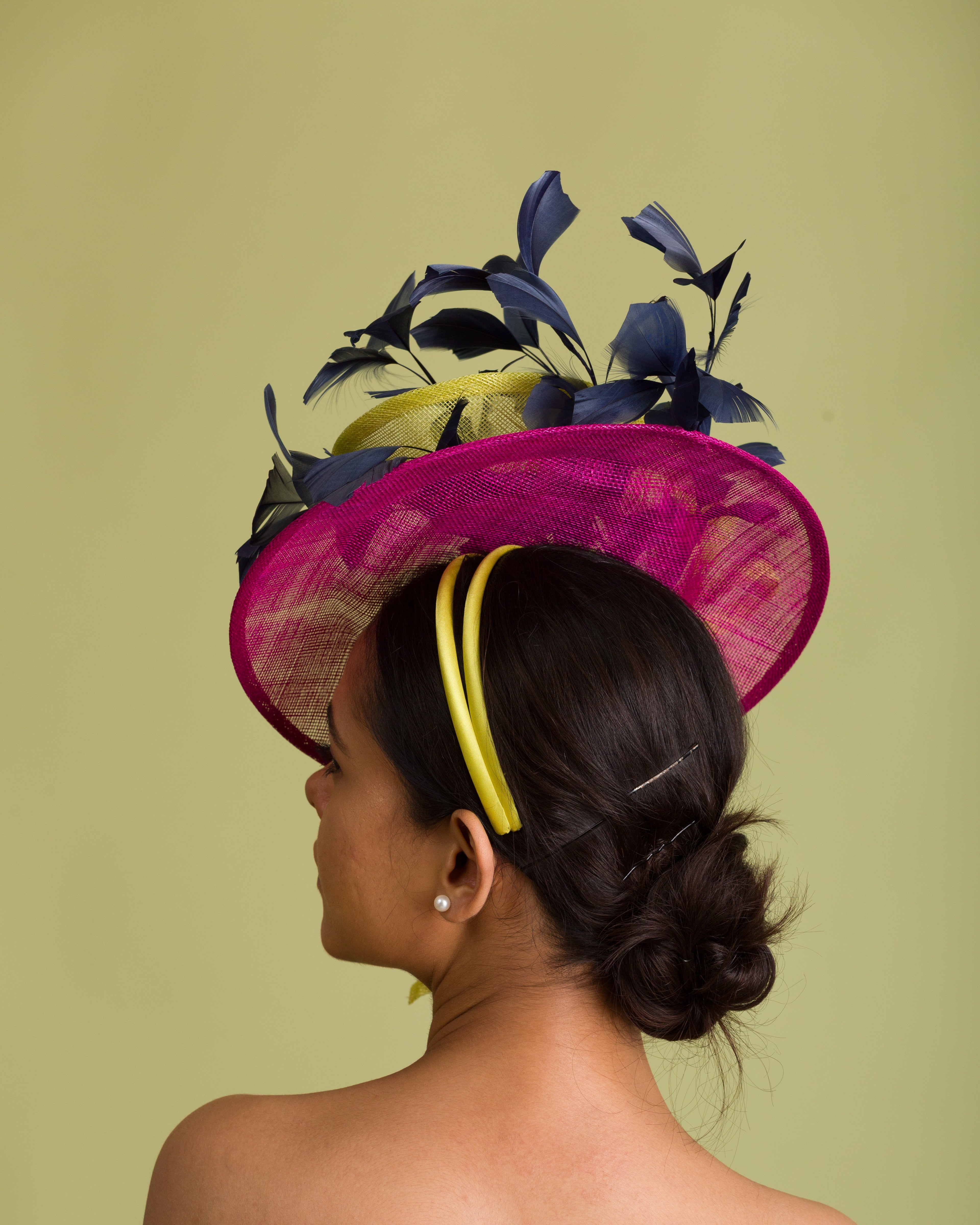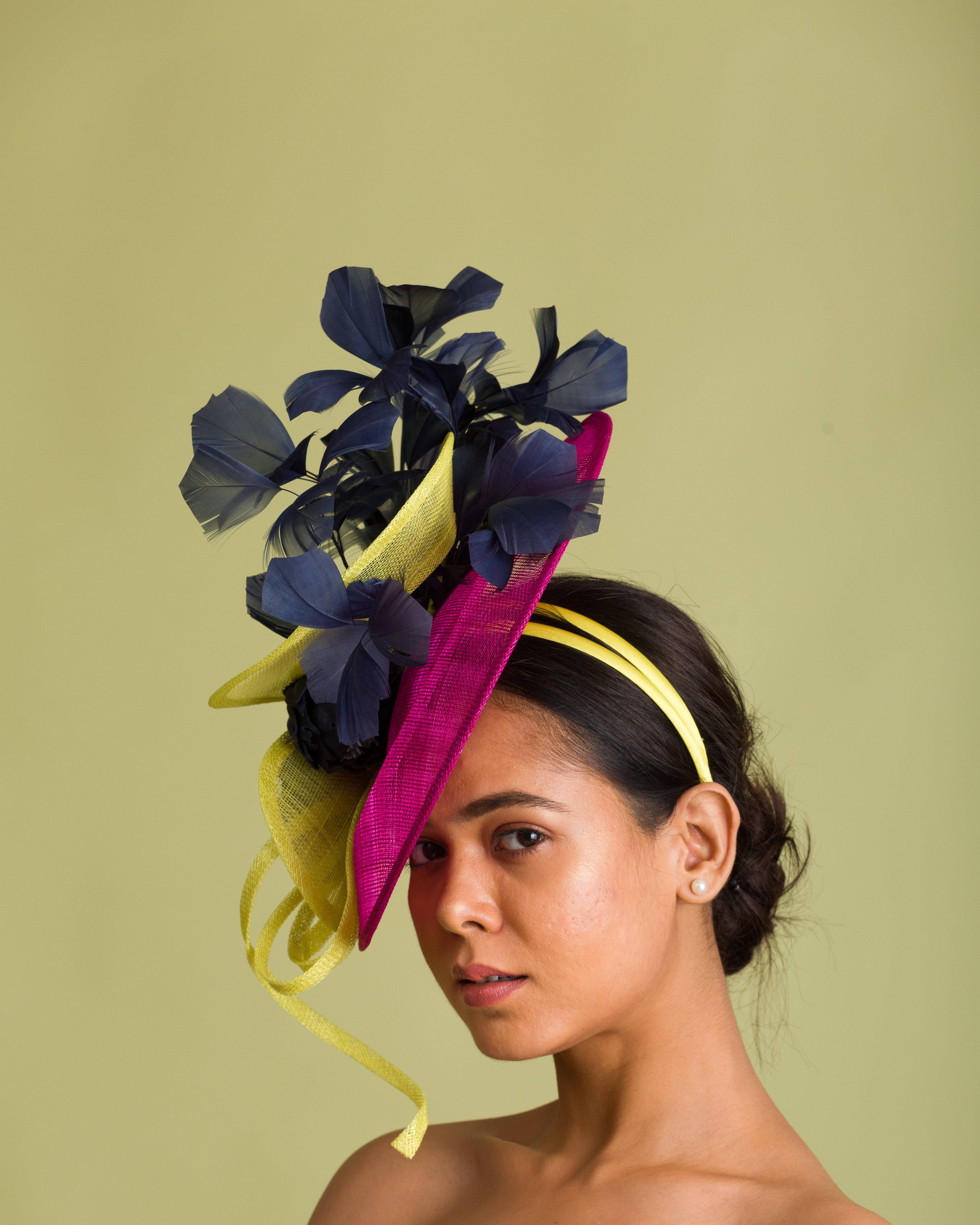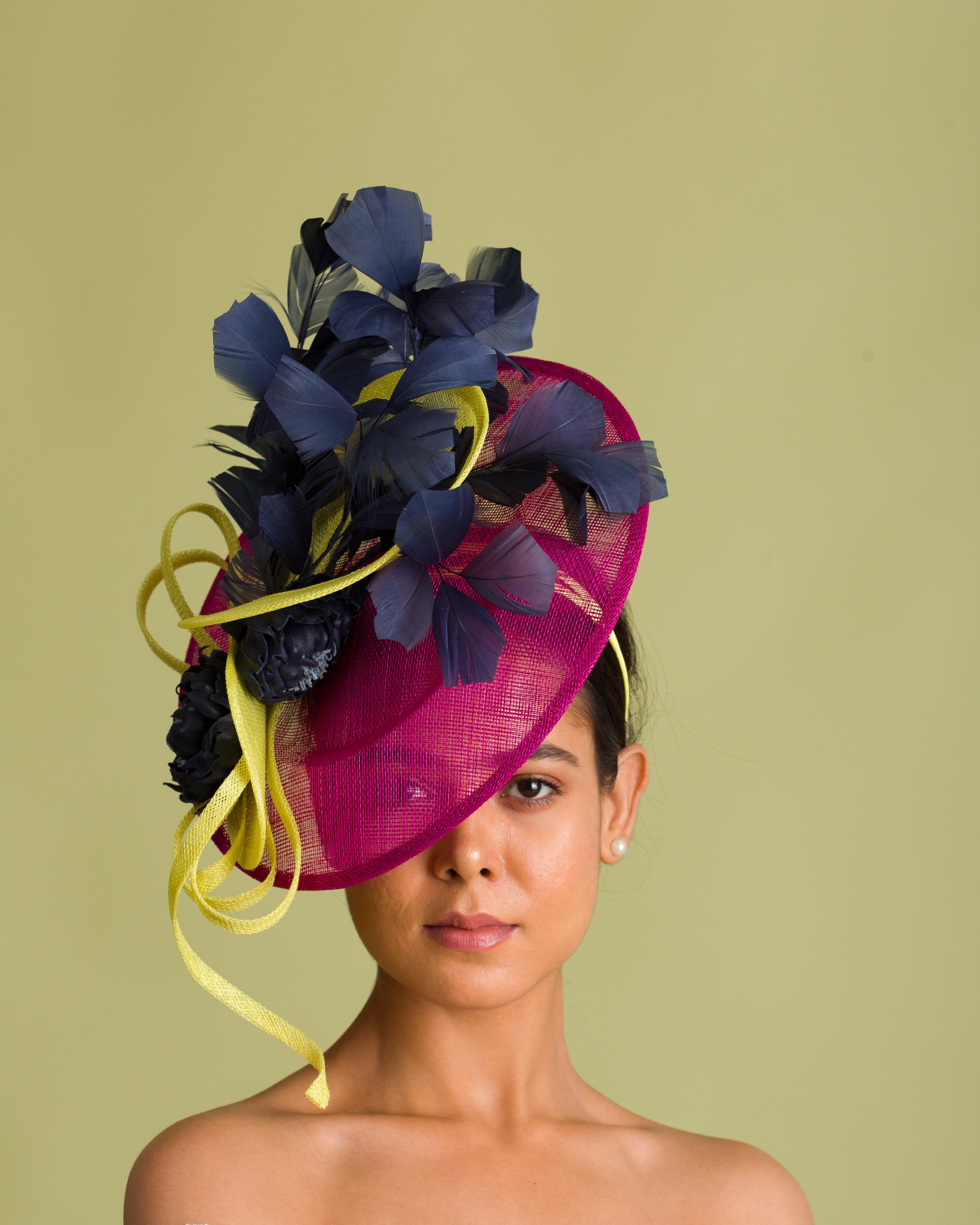 Make a statement at the races with this striking fascinator that commands attention. The hot pink base is elevated by a crisp yellow trim, while navy blue leather flowers anchored with an elegant feathers spray plume creates dramatic dimension. Expertly crafted for the Kentucky Derby, this head-turning piece combines bold color blocking with refined details. The perfect accessory for those who refuse to blend into the crowd—wear it with confidence and let your millinery do the talking.