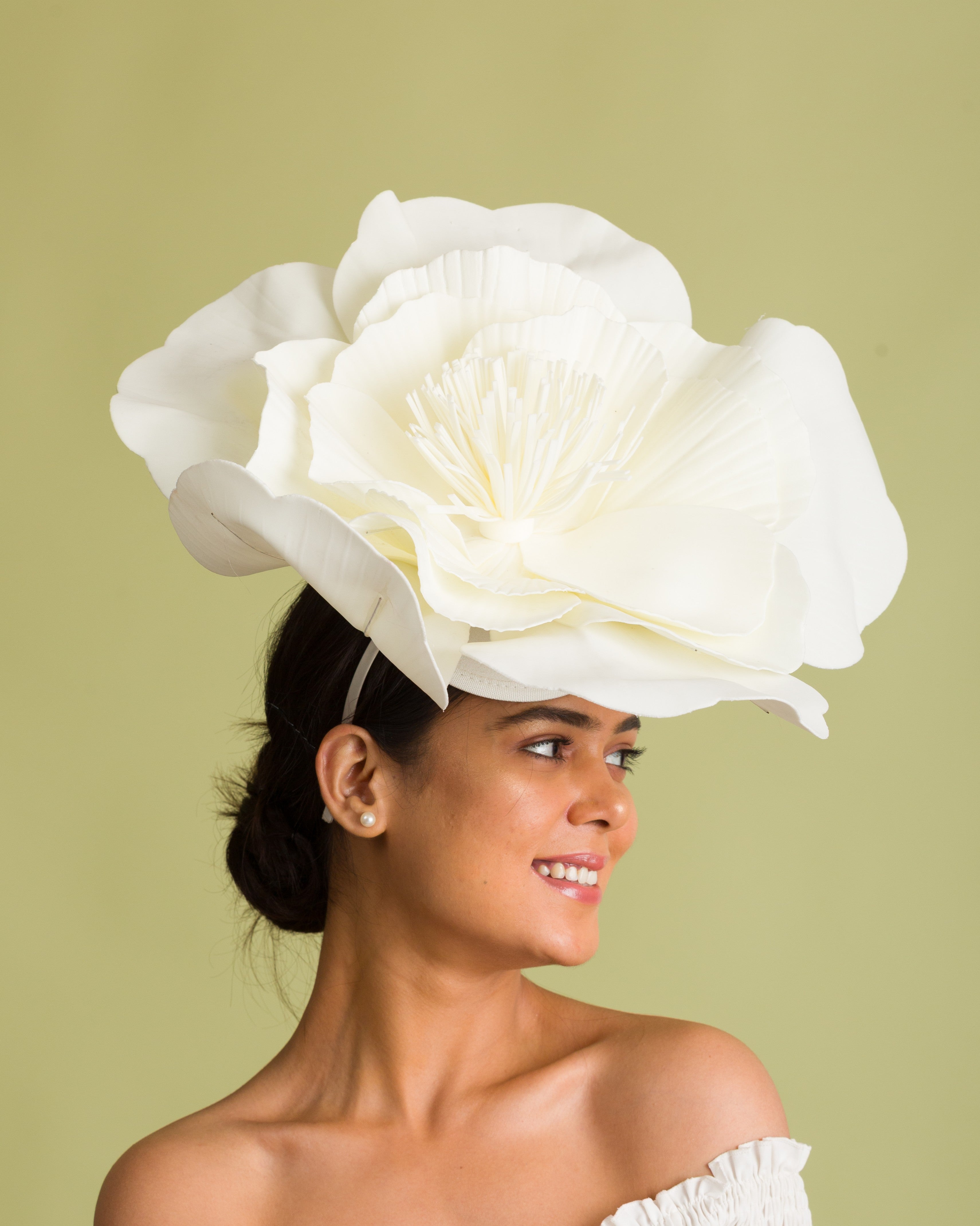 Make a sophisticated statement at the Kentucky Derby, Melbourne Cup or other horse race events, garden brunch, or tea party with this ivory floral fascinator. Crafted with delicate blooms, this elegant headpiece elevates any occasion with timeless charm.  You can add more drama to the piece by gentlly bending outer petals as per your taste.The ivory hue pairs beautifully with navy, blush, mint, soft blue, and champagne tones, while complementing floral prints and ivory accents. Perfect for A-line, fit-and-flare, sheath, midi cocktail, and lace or satin dresses, this fascinator transforms your ensemble into a polished, fashion-forward look.