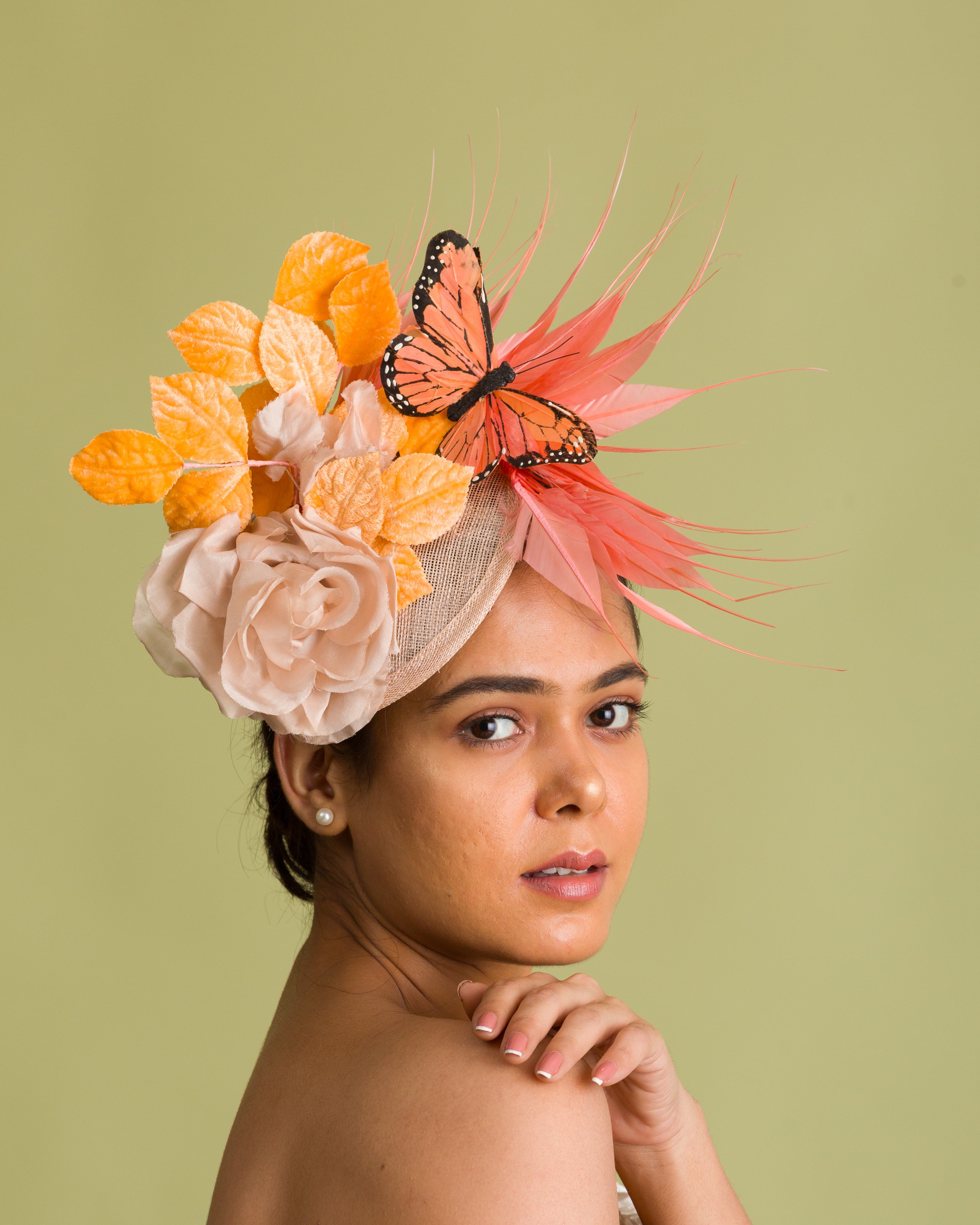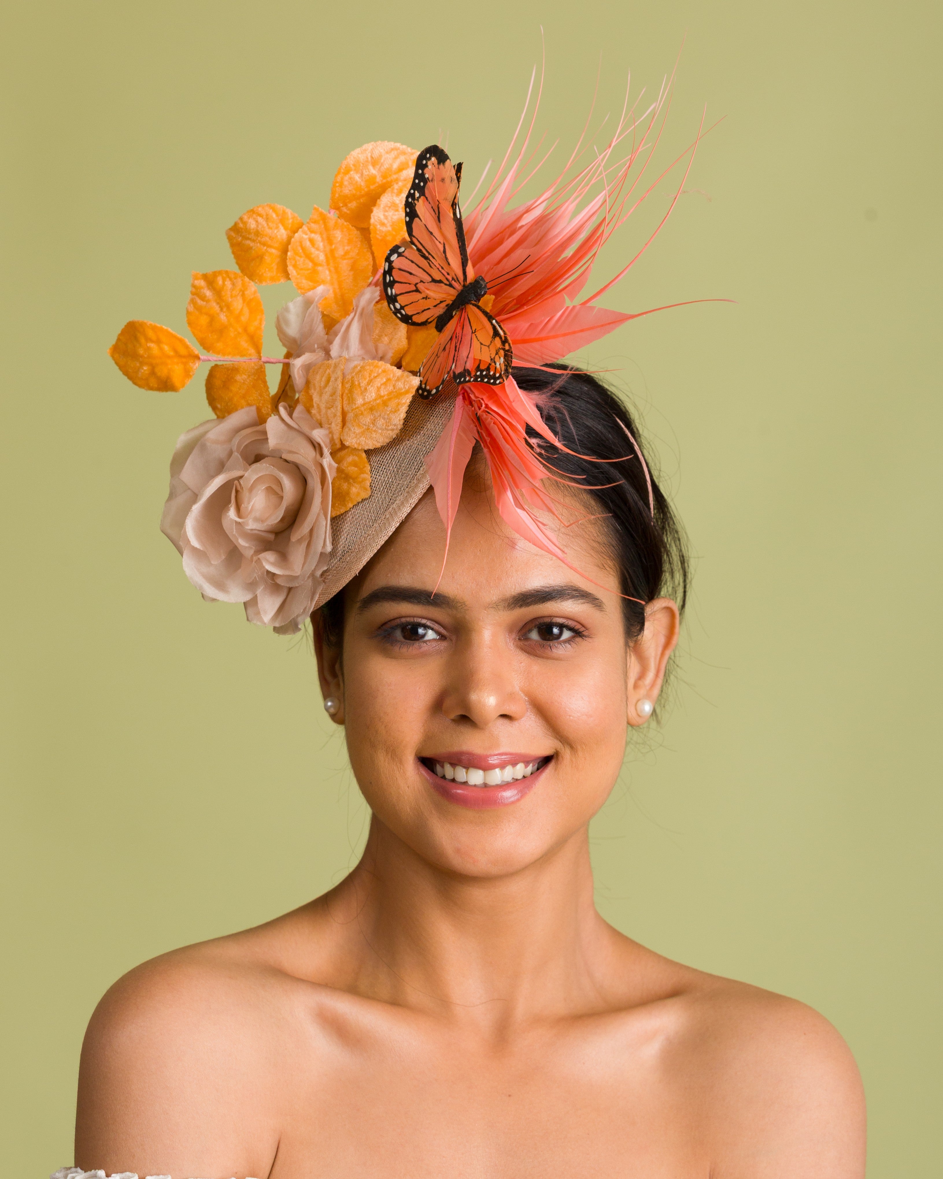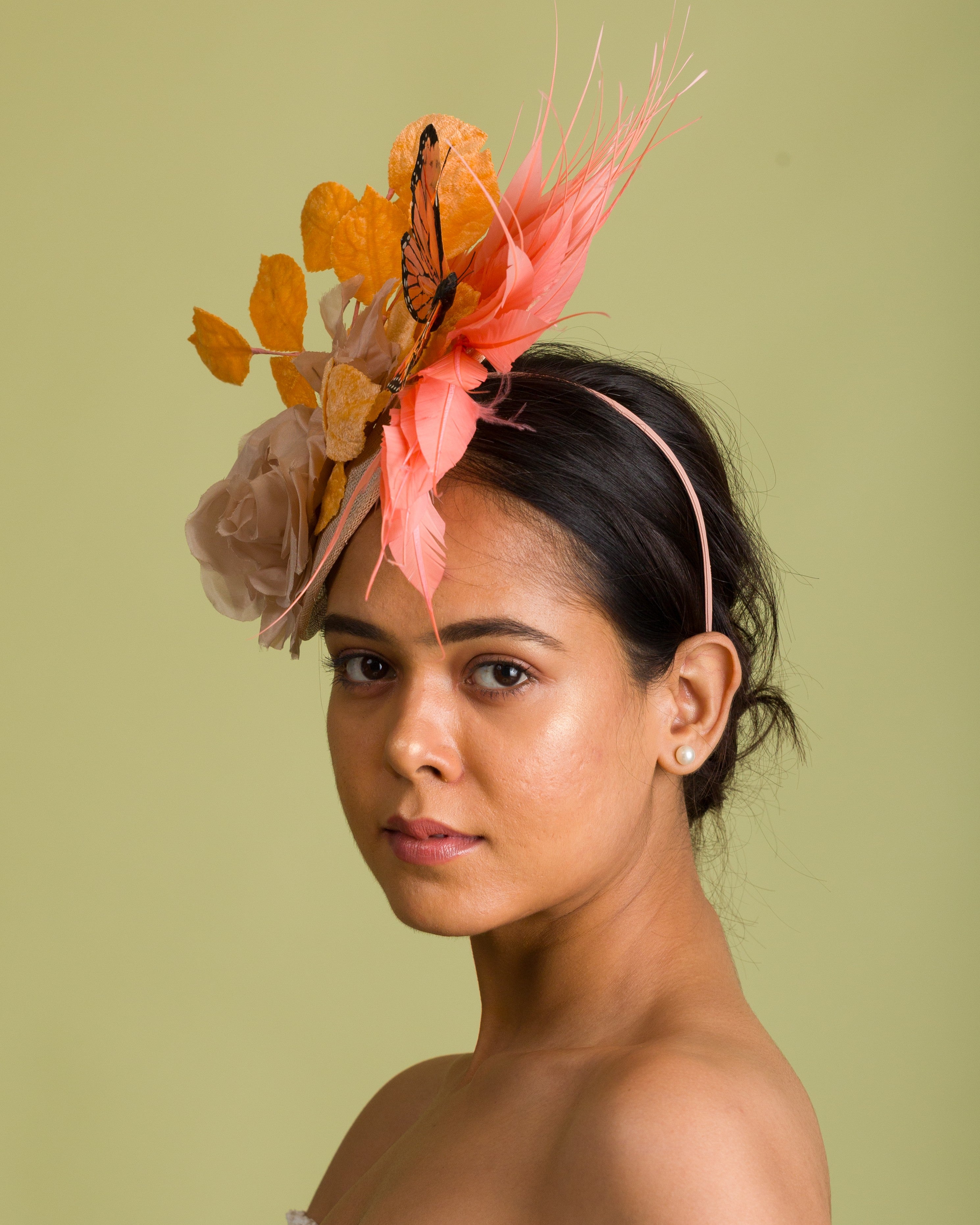 Elevate your event wardrobe with this exquisite designer fascinator, featuring a striking peach butterfly perched atop delicate peach velvet leaves and feathers. The piece sits gracefully on a pastel peach flower base, creating an understated yet sophisticated silhouette perfect for Kentucky Derby races, garden brunches, and daytime celebrations. Choose from coordinated styling options including complementary dress, shoes, and purse selections to create a cohesive, polished look. Whether you're attending a high-society event or making an entrance at an exclusive gathering, this fascinator combines artisanal craftsmanship with versatile elegance, ensuring you stand out with refined taste and attention to detail.
