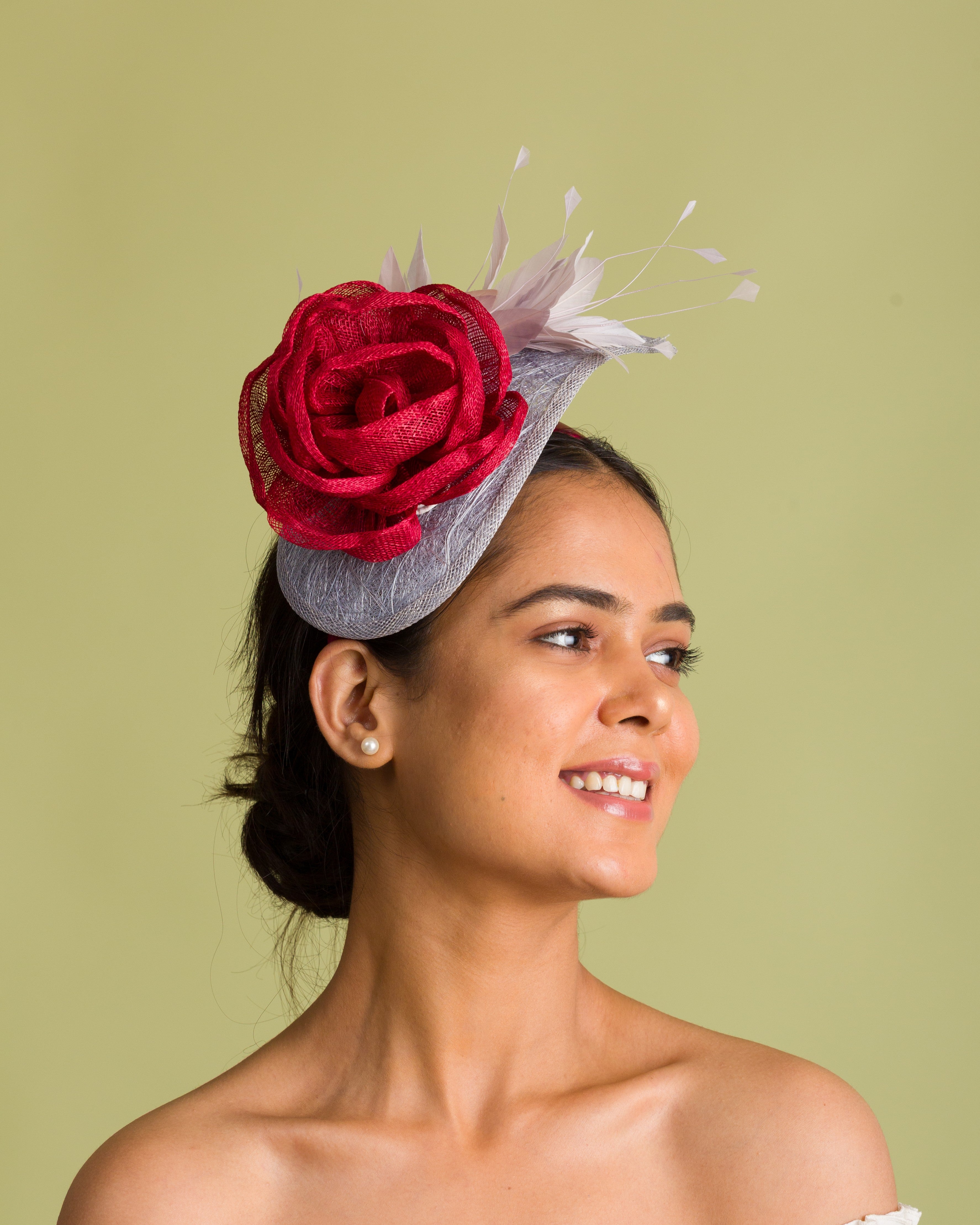 Perched on a sleek red headband, this elegant millinery creation features a tear-shaped grey fascinator base, topped with soft pastel pink feathers and a bold, oversized red rose that adds dramatic flair and couture charm. The pastel palette beautifully balances the vivid rose, making it the perfect show-stopping accessory for racewear, cocktails, derby brunches, and high-fashion spring events.