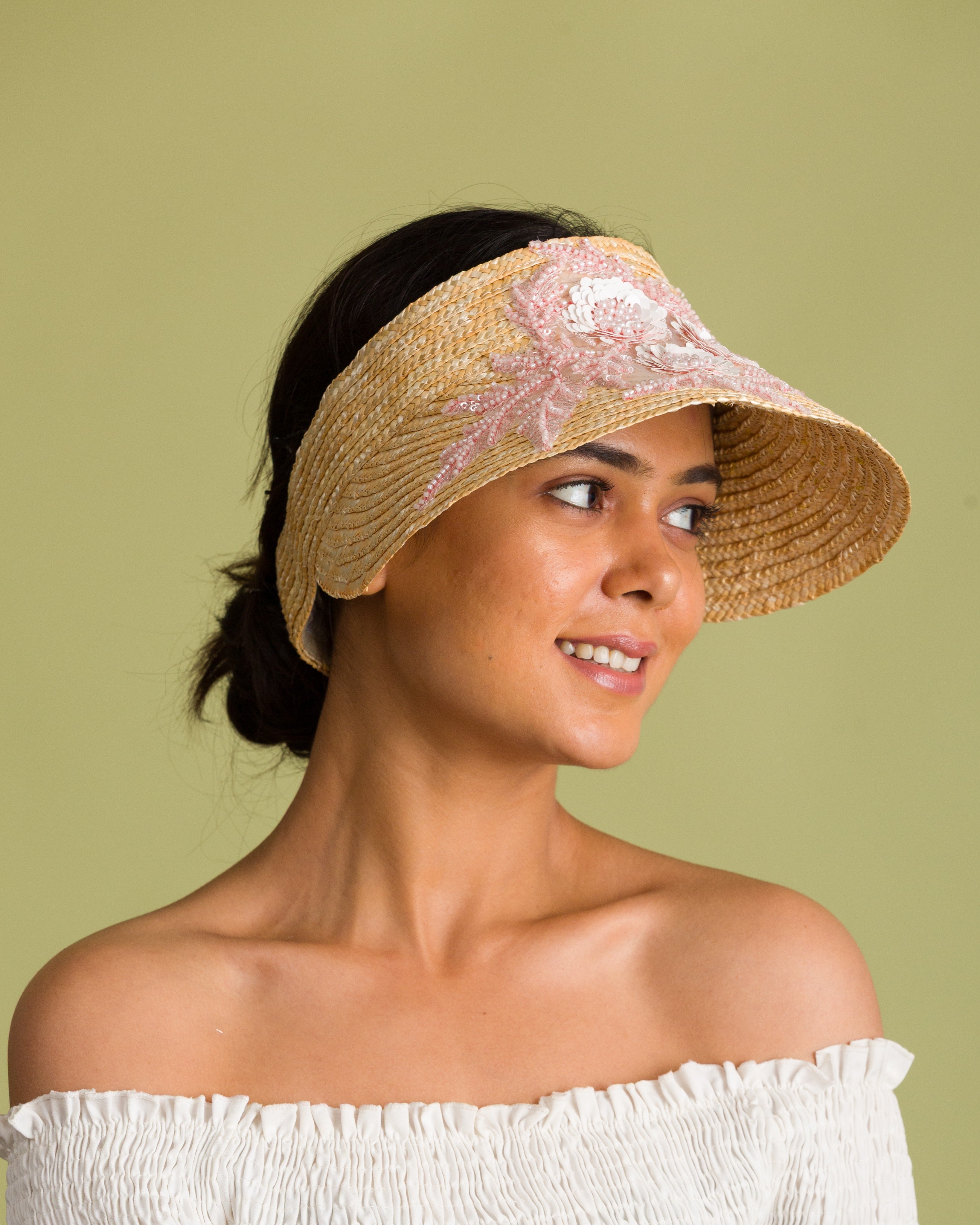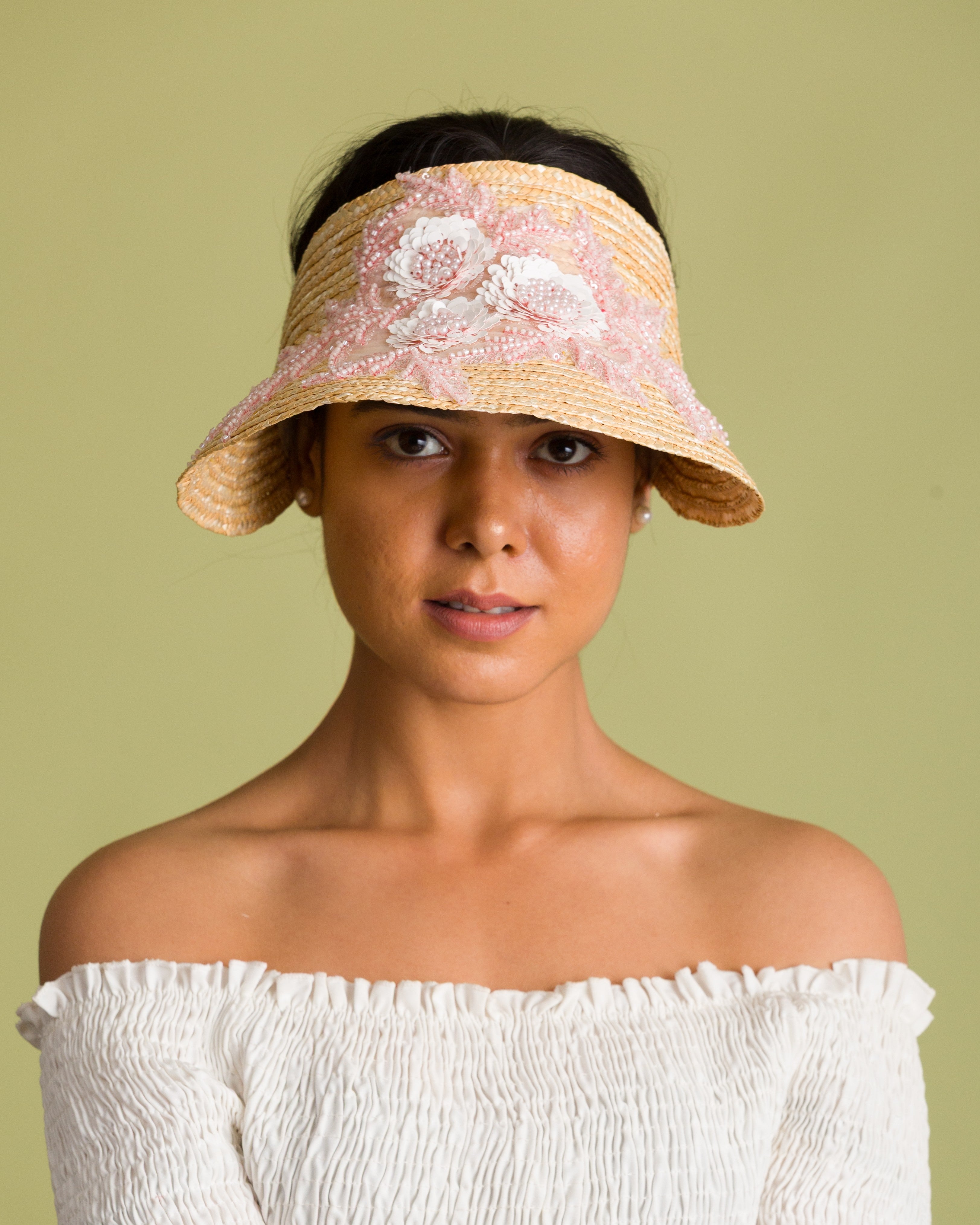 Elevate your summer style with this sophisticated beige straw sun visor, expertly crafted for the discerning woman. Featuring delicate pink embroidery work adorned with lustrous pearls and charming floral embellishments, this piece seamlessly blends functionality with refined aesthetics. The lightweight straw construction provides excellent sun protection while maintaining breathability, making it ideal for outdoor occasions. Perfect for garden parties, beach outings, or casual daytime wear, this visor offers both elegance and practicality. The intricate detailing showcases artisanal craftsmanship, ensuring you stand out with understated luxury.