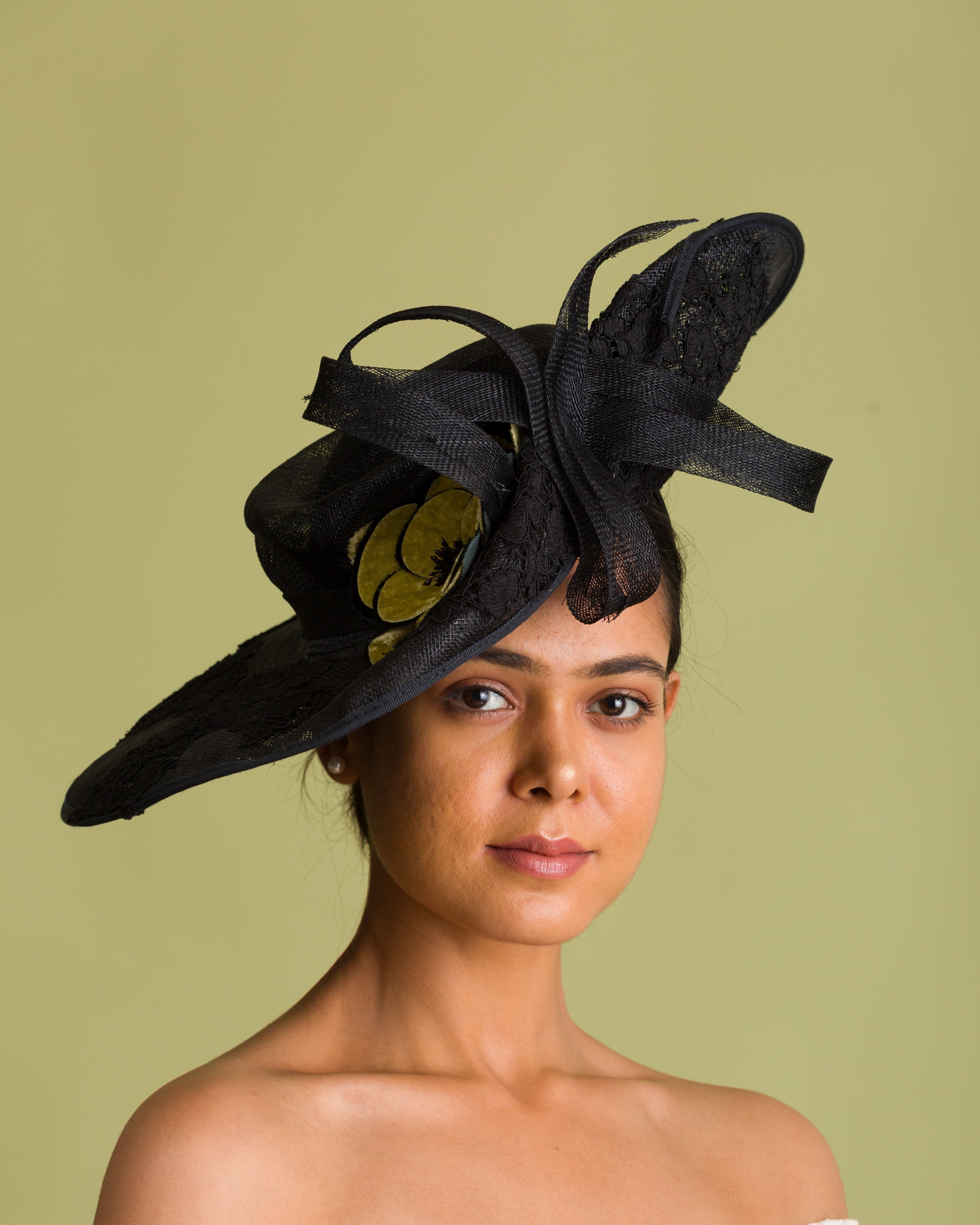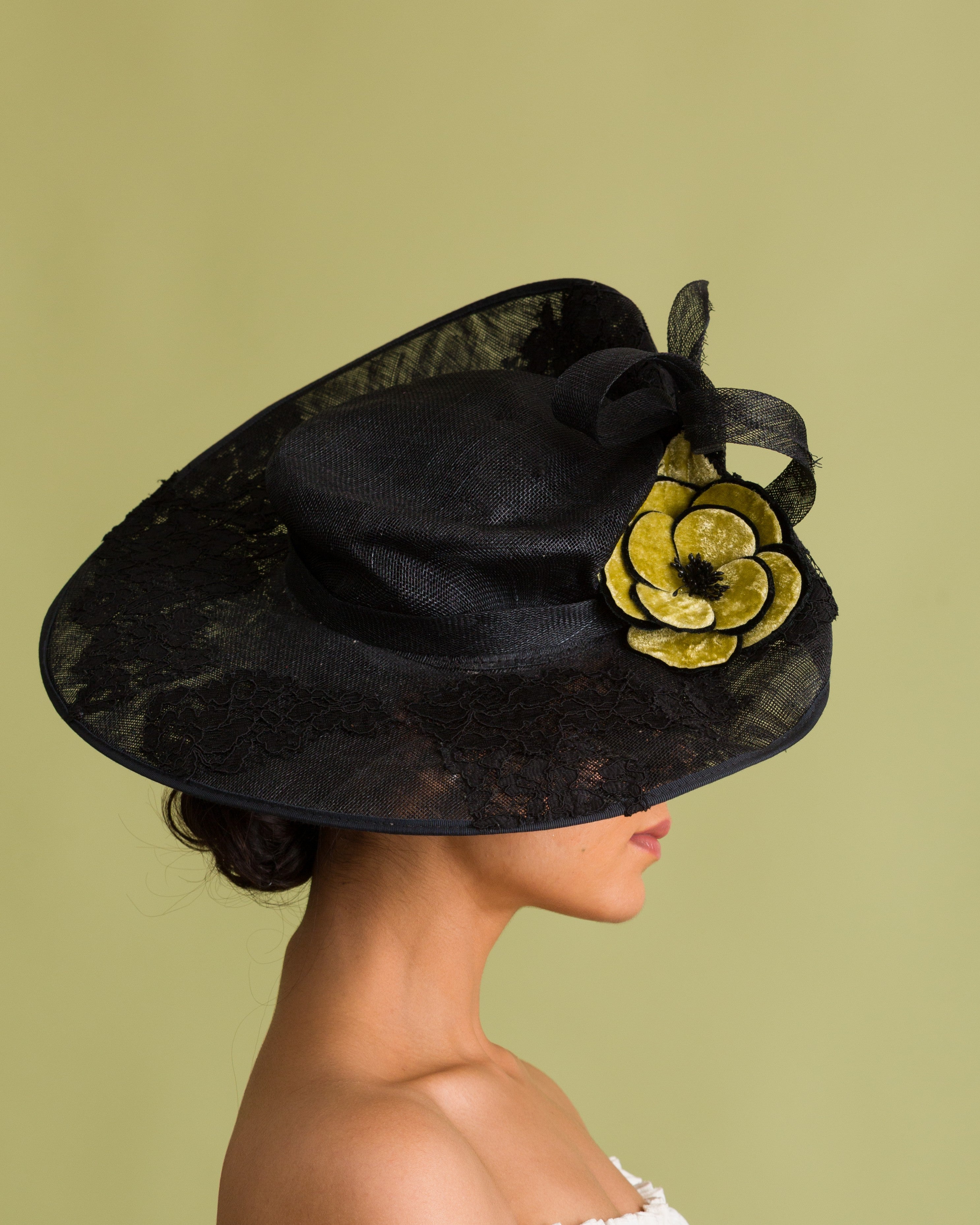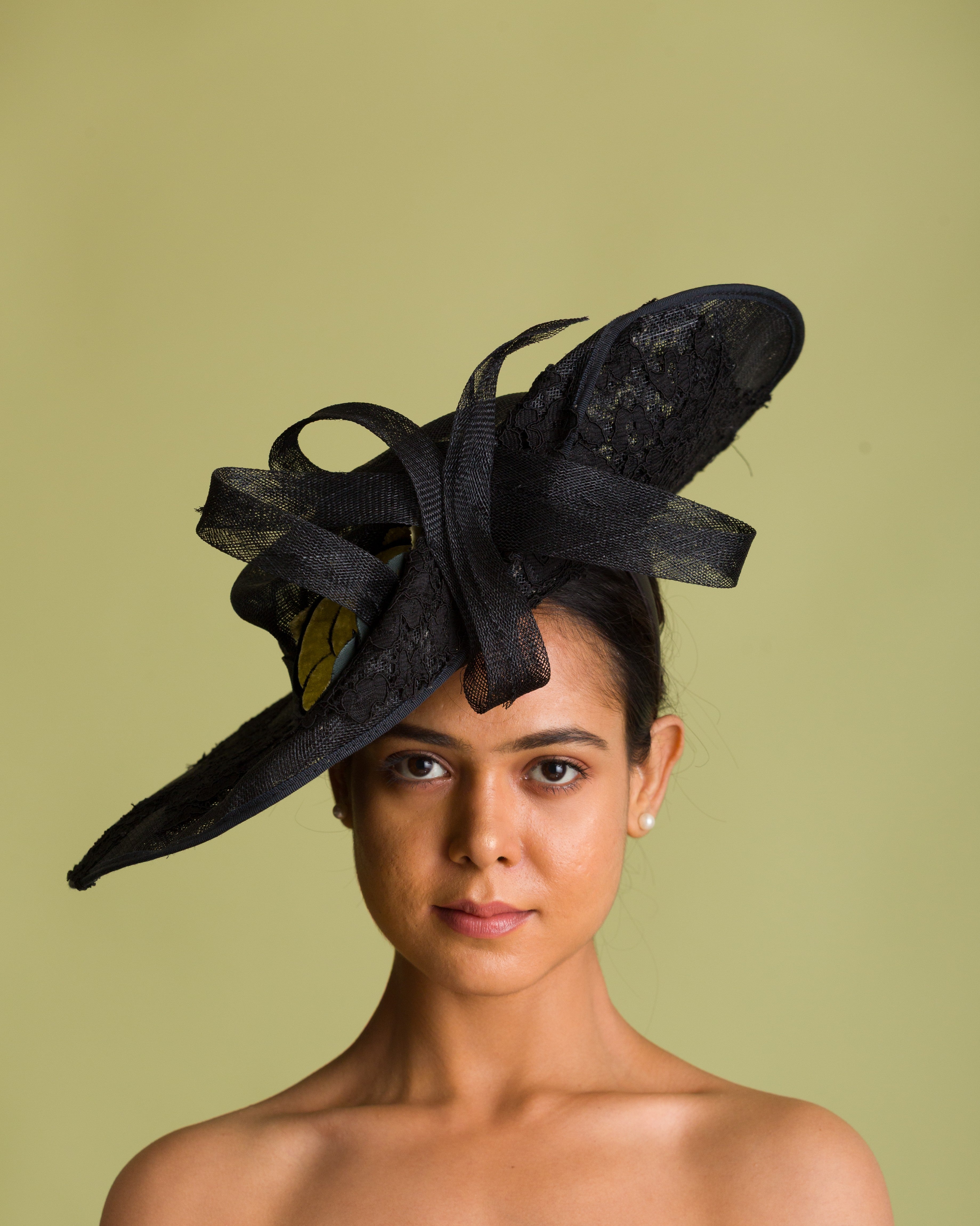 Elevate your race-day style with this elegant black Derby hatinator crafted from premium black abaca fiber and finished with intricate black embroidered detailing with asymmetrical brim. A luxurious golden yellow velvet flower adds the perfect subtle pop of color, while the sleek black trim and comfortable headband fitting keep the look refined and easy to wear all day.